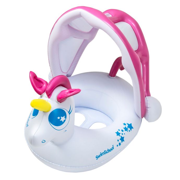 The swimways sun canopy baby boat is an inflatable baby floaty with bright engaging colors and characters that babies love the wide circumference and wings enhance stability in the water and the removable canopy provides shade.